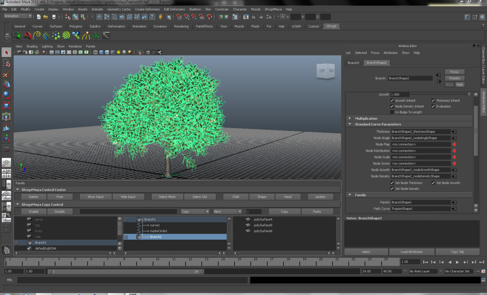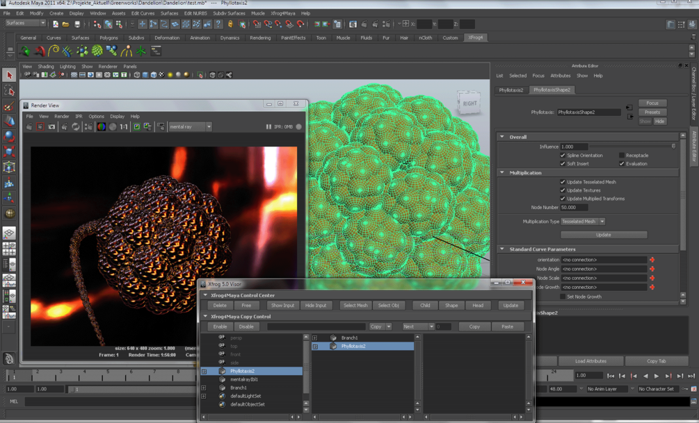 The Xfrog Maya procedural organic 3D modeling plugin enables you to create and animate 3d trees, shrubs, flowers, nature based efx and biomemtic architectural forms. Xfrog enables even the most casual user with the powerful ability to create and animate organic models. Take the Feature Tour to see what Xfrog Maya can do for you.